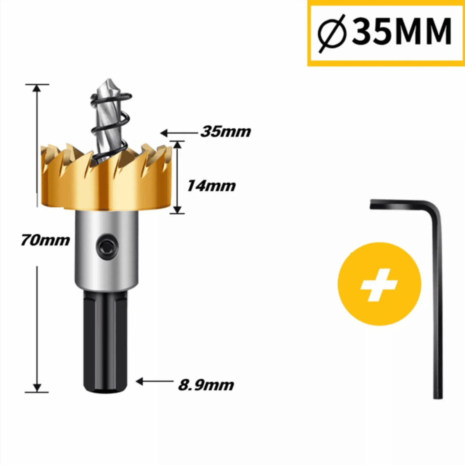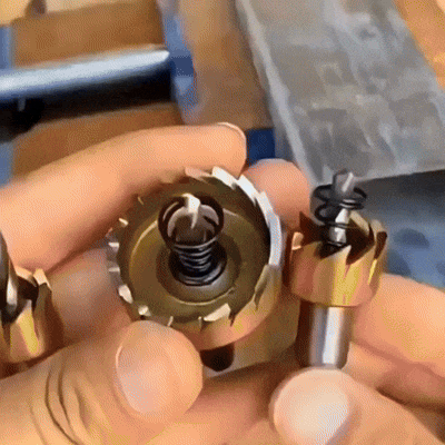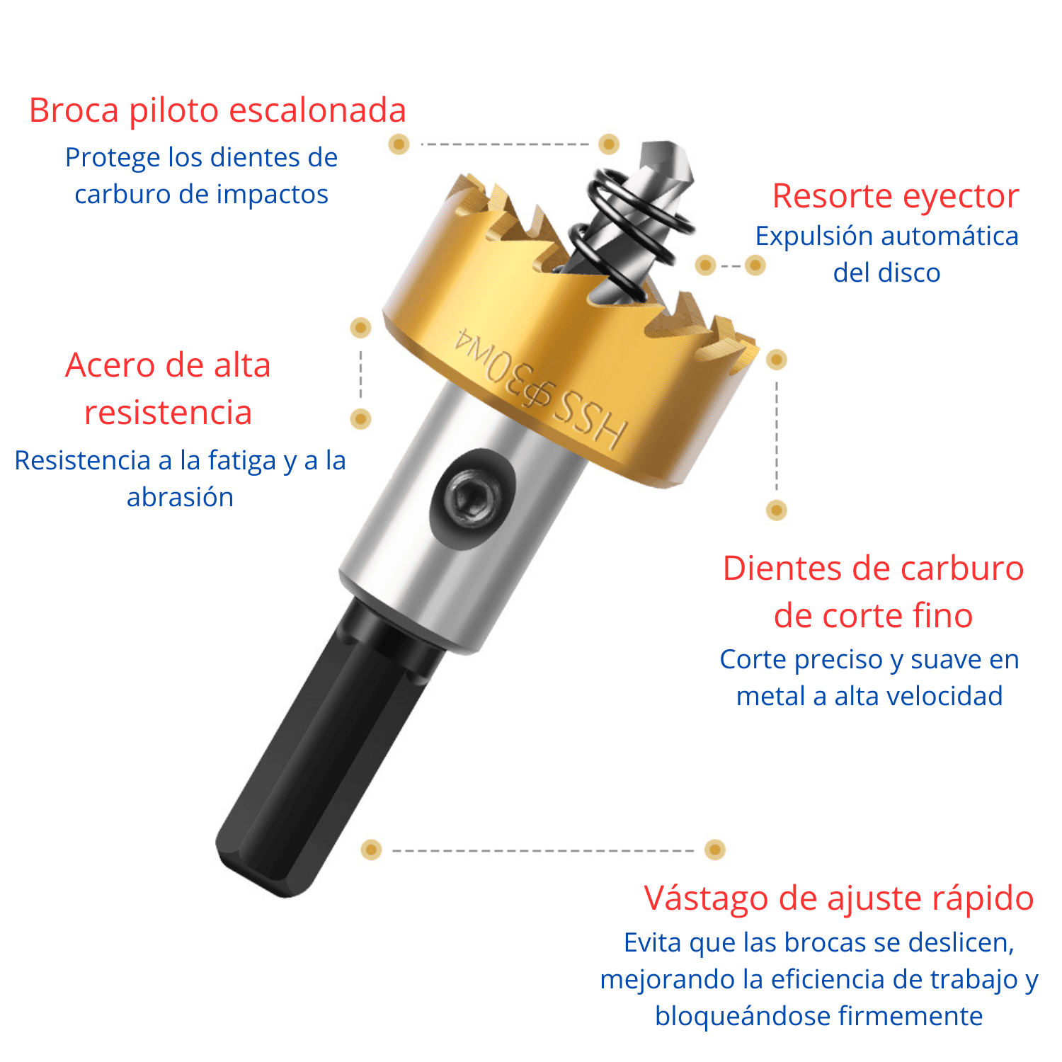 Cabeza HSS 4241 con recubrimiento de titanio. Sistema saca-bocados para retirar el material sin esfuerzo.