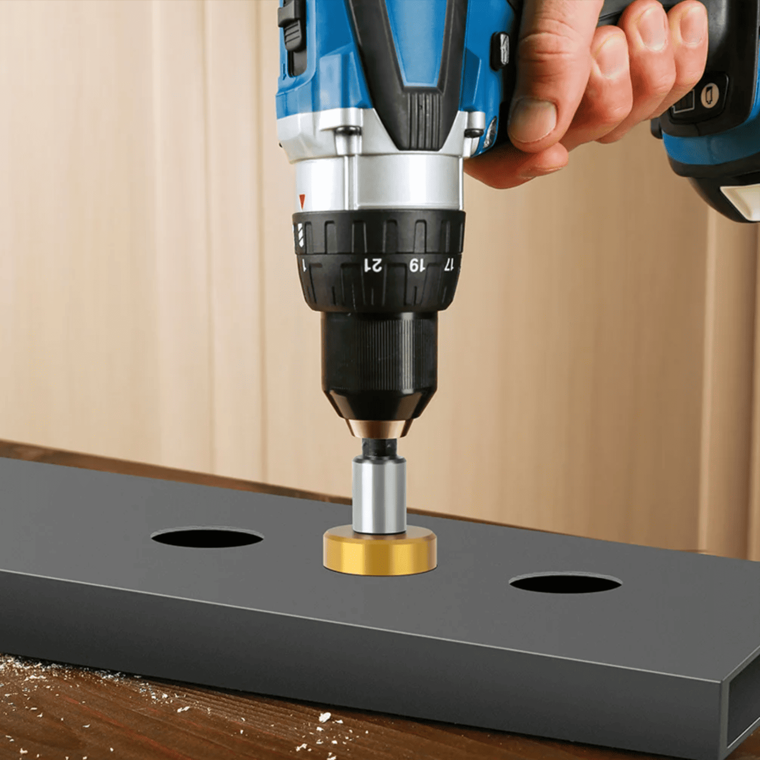 Instálala en tu taladro, apunta, perfora y el sistema saca-bocados hace el resto. ¡Precisión sin complicaciones!